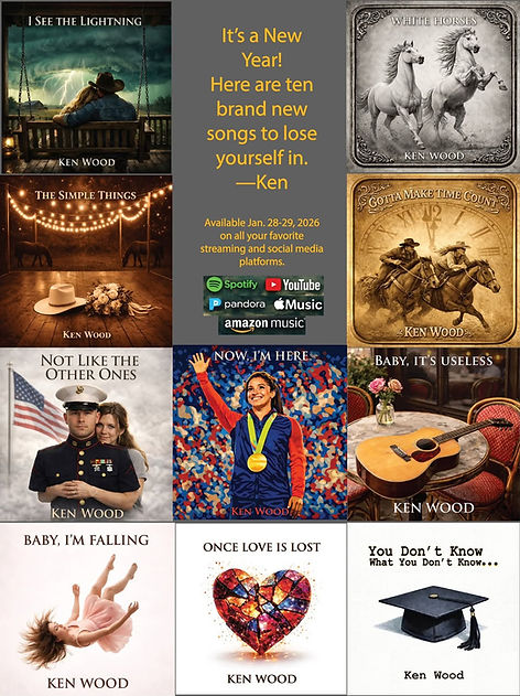 Ten New Songs you must hear, featuring numerous vocal personas singing Ken Wood originals. Out on Spotify and all streaming services as of January 28-29, 2026